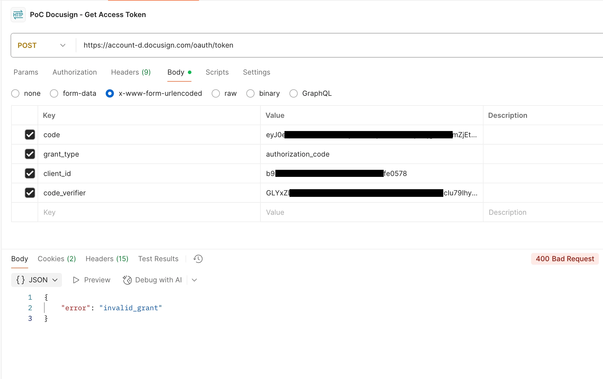I’m getting the following error when requesting an access token from the authorization code previously generated by Docusign: