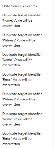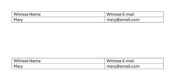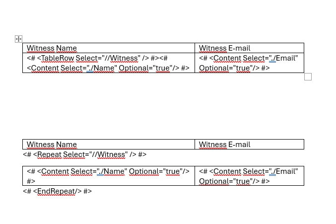 The issue I'm facing is related to data coming from a table in the initial form (multiple entries/rows). When I use the “TableRow Select” or “Repeat Select” tags in my Word template to display this data in a table, only the last row of data entered in the form is showing in the generated document. The previous rows are being overwritten.
