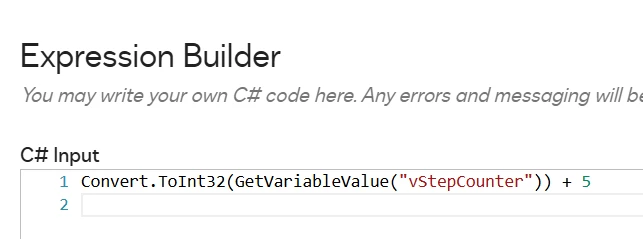 I don’t think this is the issue but one minor thing I see is the vStepCounter variable in the Update Variable Value 2 step should be incrementing by (roughly) the number of steps being processed in each loop, not set to a static 0. To do that, change vStepCounter to a Number type (right now it’s text). Using the expression builder, set the value of vStepCounter to: Convert.ToInt32(GetVariableValue("vStepCounter")) + 5.