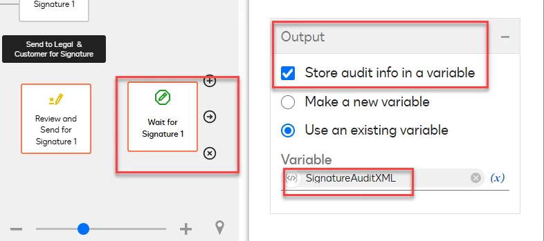 The Review and Send for Signature step doesn’t give you anything to use but this step is always paired with the “Wait for Signature” step which does give an XML output that you can use. From the “Wait for Signature” step’s properties, scroll down until you see “Output” and select “Store audit info in a variable”. Name the variable anything you’d like - we usually use something like “SignatureAuditXML”.
