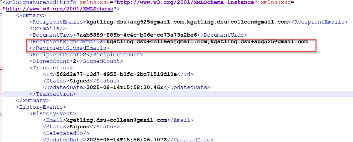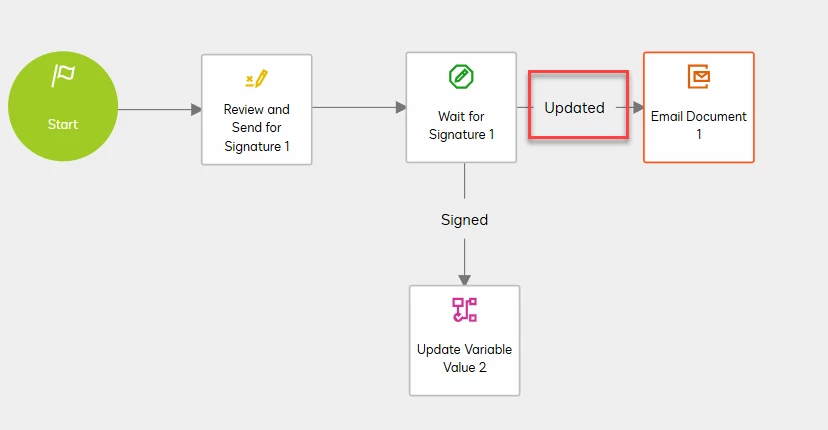 From there, once the signature is complete, the recipient information will be stored in the SignatureAuditXML variable and you can use this to update the recipient of the Email Document step.