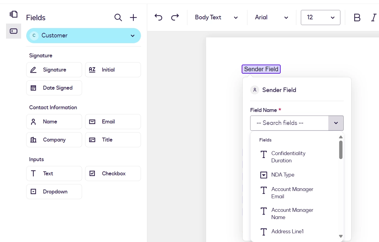 After creating those fields, then I set up a template and upload a envelop word file. I wanted to insert/place those document custom fields in the document, they do not appear in the sender’s filed drop down list.