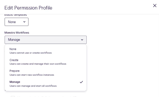 } Even when the Admin UI displays Maestro = "manage" for that profile, Maestro may still not allow the user to create or manage workflows if the underlying AuthZ relationships were not refreshed the way Maestro expects.