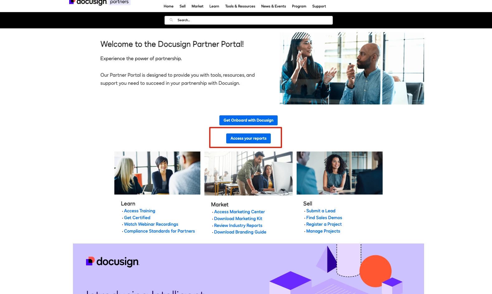 - Log in to the Docusign Partner Portal and select "Access your reports." You can also find the reports under the Tools & Resources tab.