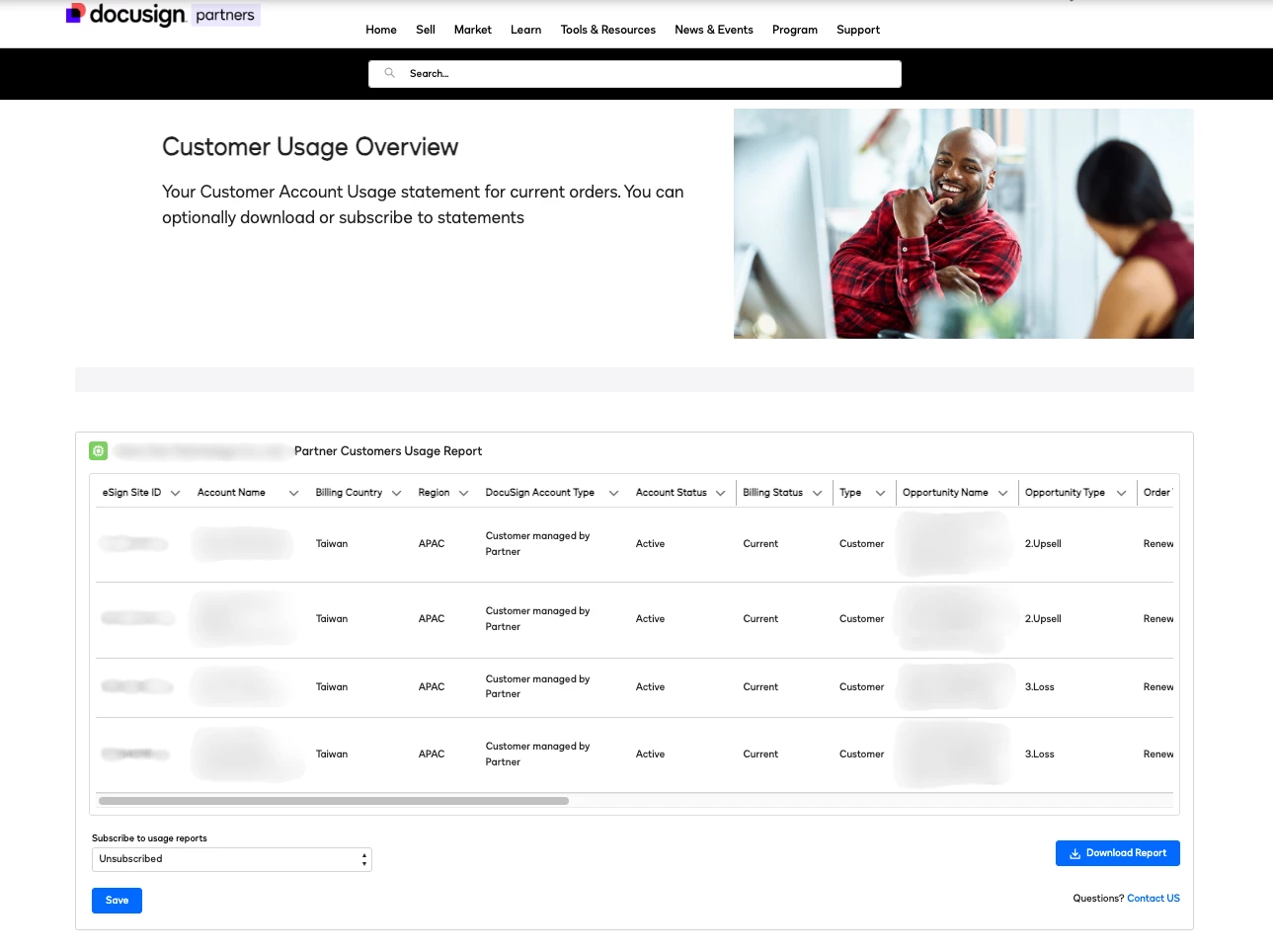 - Self-Service Access: View and download customer usage data in a CSV format right from the Docusign Partner Portal.