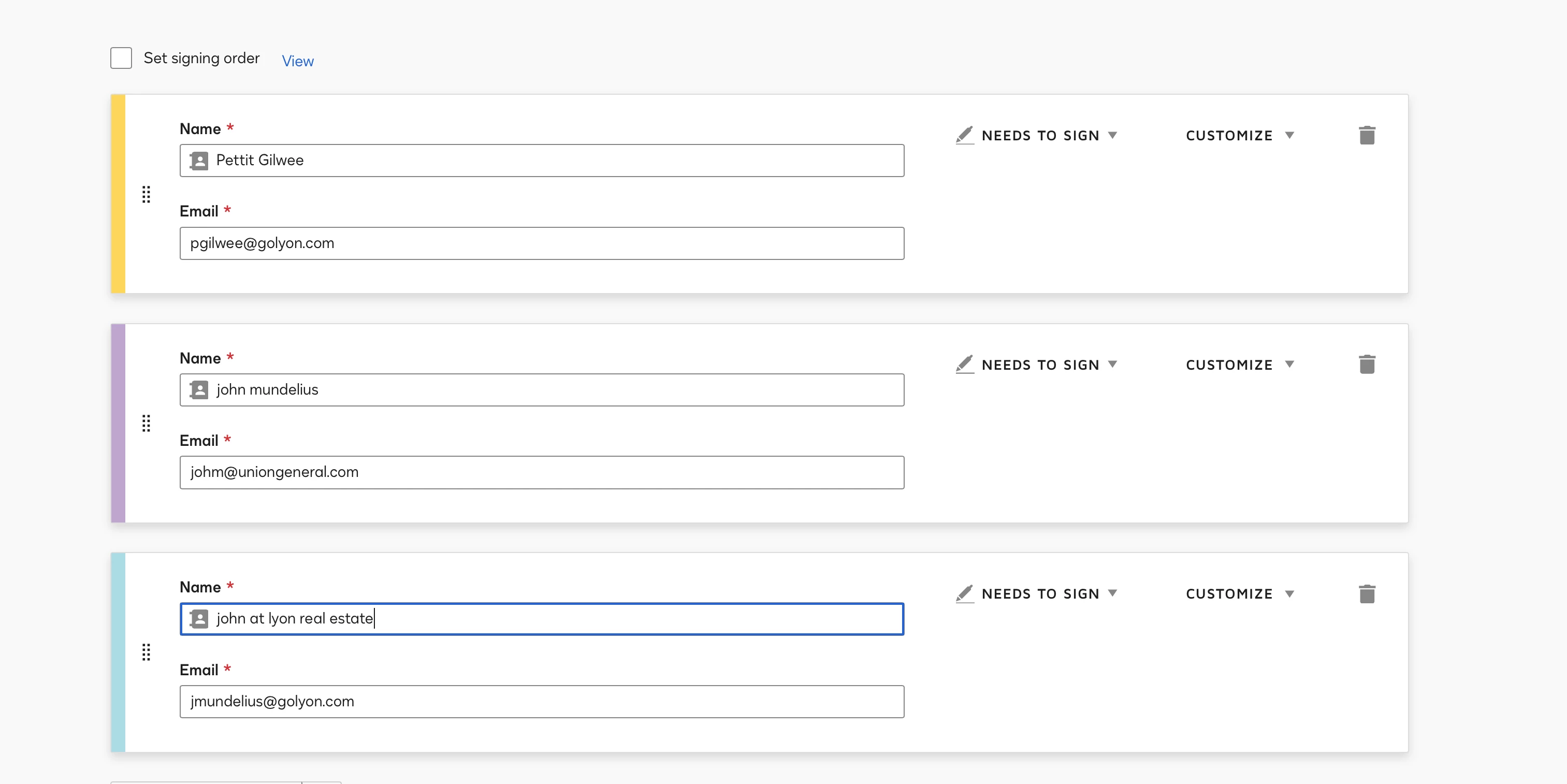 That means all three recipients getting the document to sign at the “Same Time” and there is not first or second signer at all. You can try putting your three different email addresses and test it out.