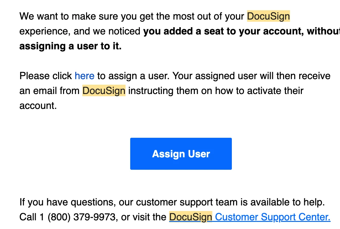 I continue getting emails that I added a seat and I need to assign a user, but it’s only me on the account. When I enter my own email it says I am already a user. Docusign says I have two users.