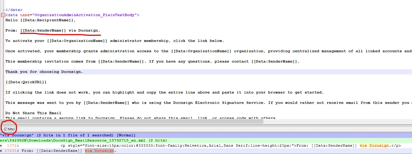 There are only two results returned when searching ‘via Docusign’ and they are for account admin activation.