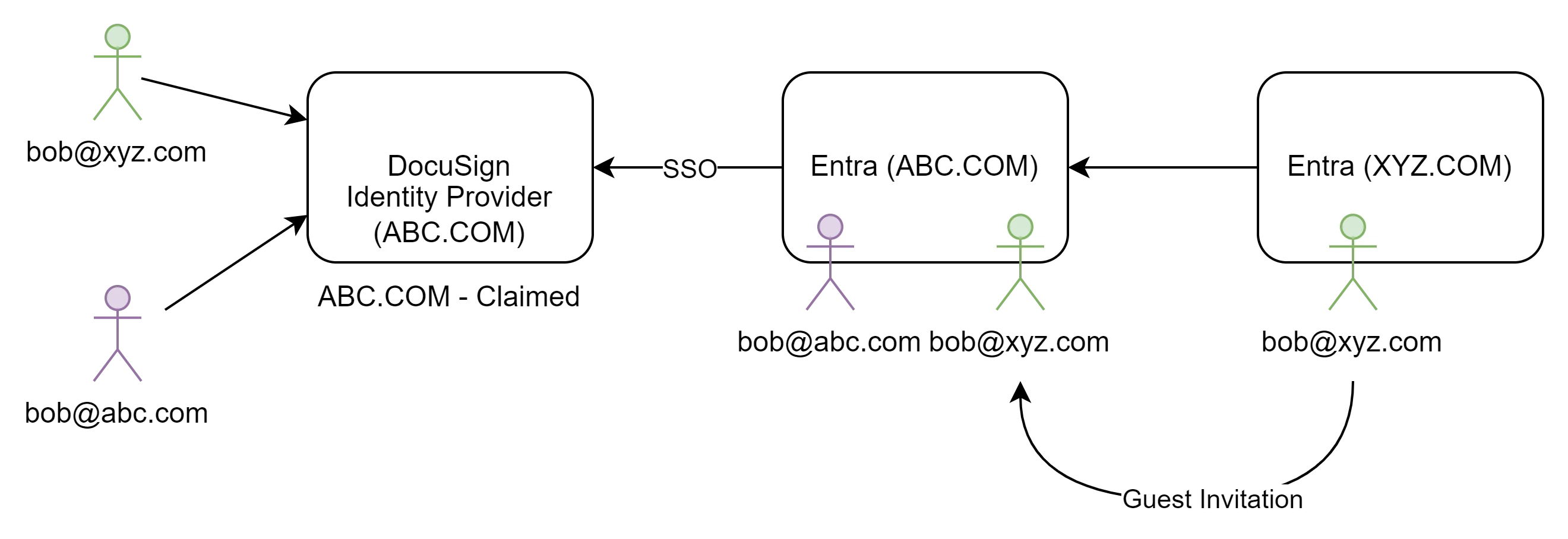 Think about a scenario, My company would like to sign a contract with a Partner company (lets say xyz.com). I have invited xyz employee as a guest (with bob@xyz.com email) in my company (lets say abc.com) for MS teams access for file sharing. Now he require access to DocuSign as well and i don’t want to create his another account and password in DocuSign. Rather, i would like him to use his existing guest account (with bob@xyz.com email) and SSO for other applications access as well. My requirement is all authentications request should reach to abc.com tenant and without claiming each Partner domain in DocuSign, all guest users should be able to access my DocuSign instance.