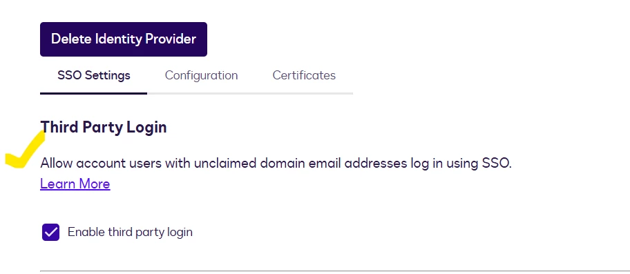 Feature enabled: “Allow account users with unclaimed domain email addresses log in using SSO” (Third Party Login)