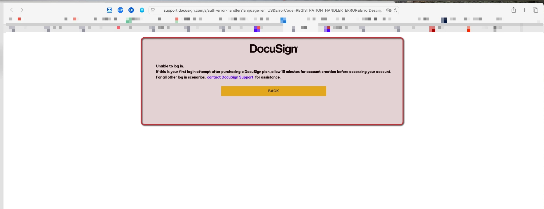If this is your first login attempt after purchasing a DocuSign plan, allow 15 minutes for account creation before accessing your account.