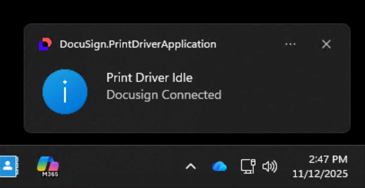 On startup of the print driver, once it is idle you get a popup notification at the bottom right corner of the screen that says that the driver is idle. This is unnecessary and I don’t see a way to turn it off.
