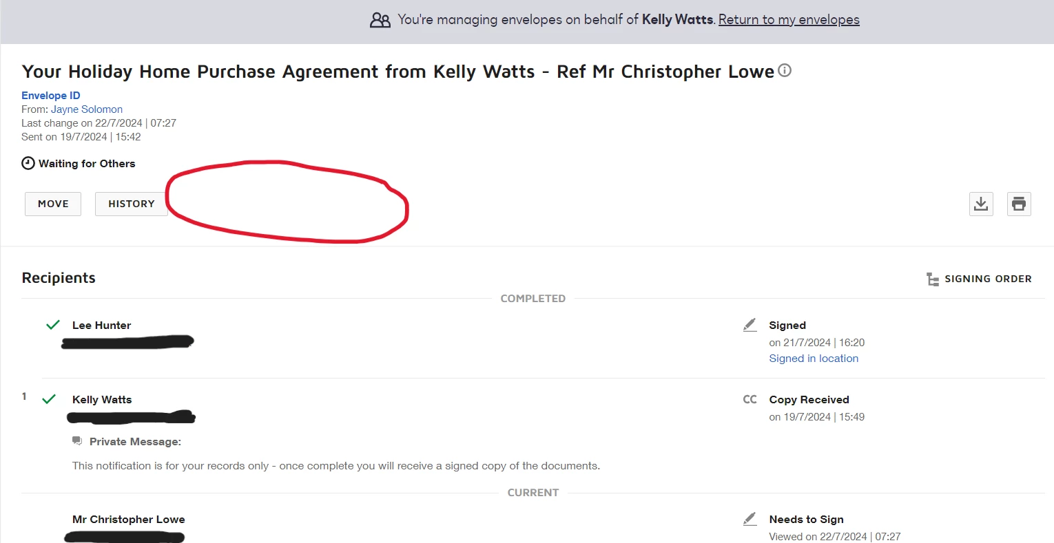 The user, Jayne, is managing envelopes on behalf of Kelly. The envelope is in a Waiting for Others status so we would expect Jayne to be able to void. Why is this not appearing?