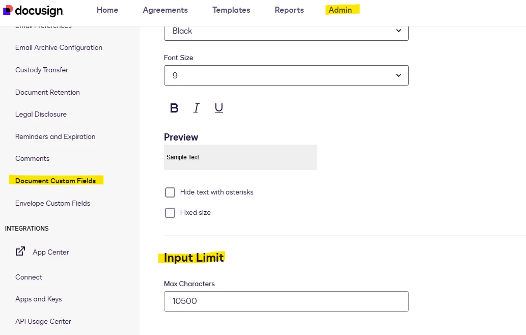 To do this, go to Admin > Document Custom Fields > Add Document Custom Field. Under the input limit section, specify the maximum characters for the text field, then Save.