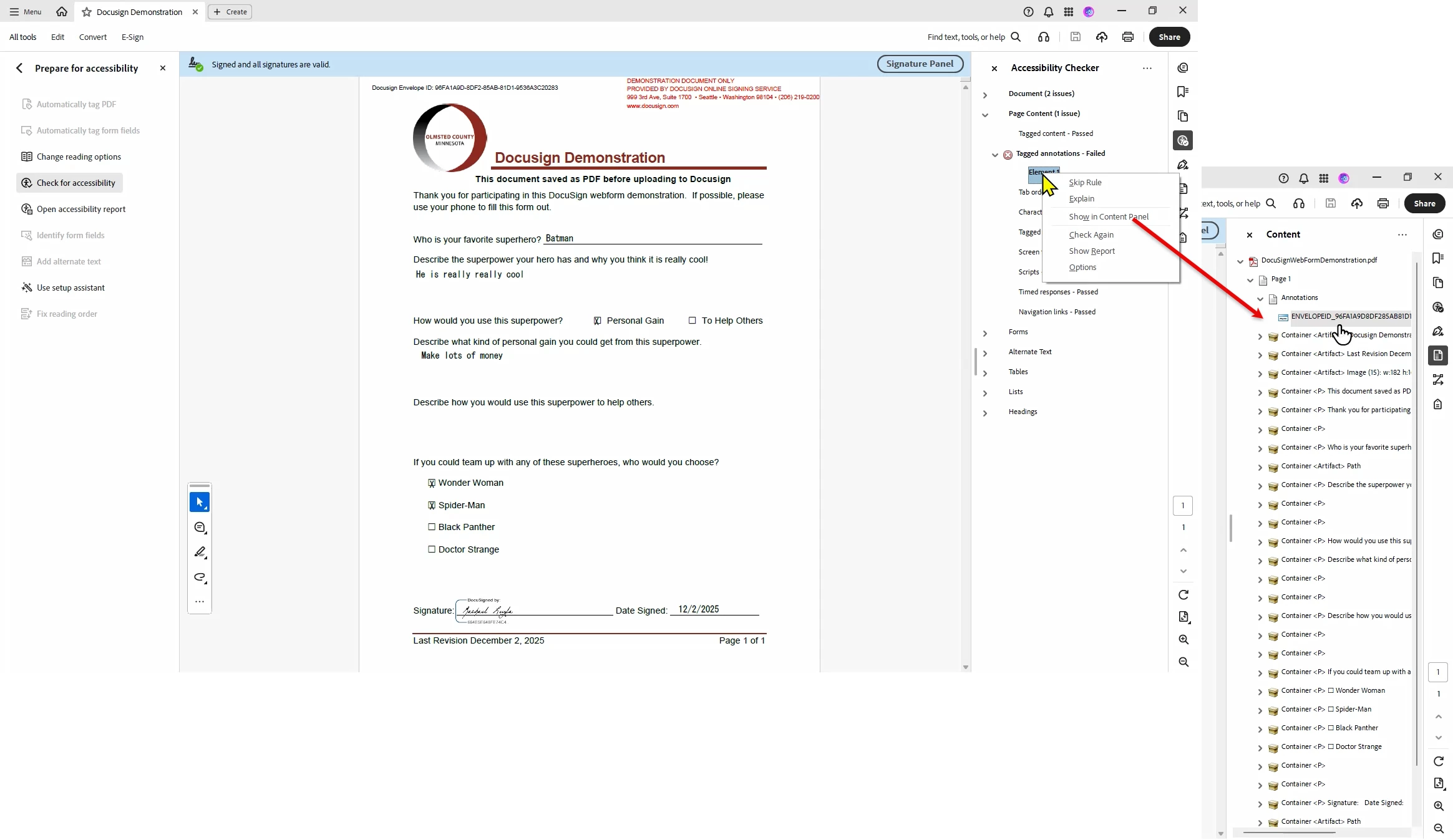 I’m attaching two post-signed downloads. When I run the documents through Adobe Pro’s accessibility checker there is one error. The error is the same for both documents. Tagged annotations - Failed. Element 1.