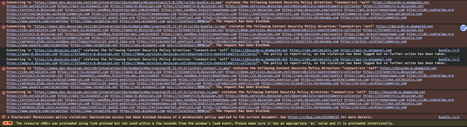 Long story short, I had an embedded E-Signature set up and working without issue last month. Now it only works on my staging server and not on my local. Locally I’m receiving the screenshotted error in my console along with many more. I’ve been trying to work through it with google and other posts be am getting no where and falling behind on my development schedule. Any assistance would be greatly appreciated.