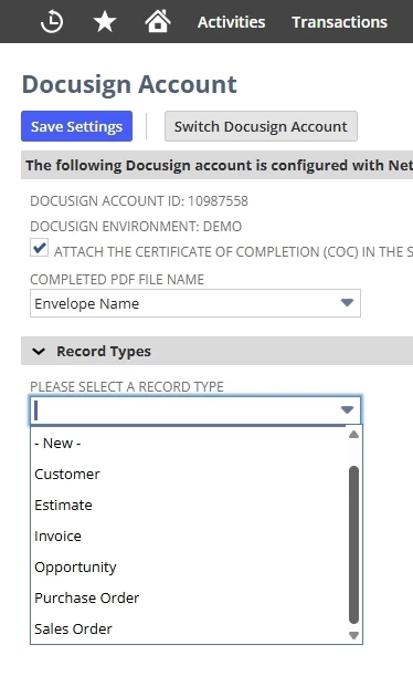 I need to add another record type to dropdown box of NetSuite Docusign Setting (Custom Record). Just appears 6 records type (Customer, Estimate, Invoice, Opportunity, Purchase Order and Sales Order)