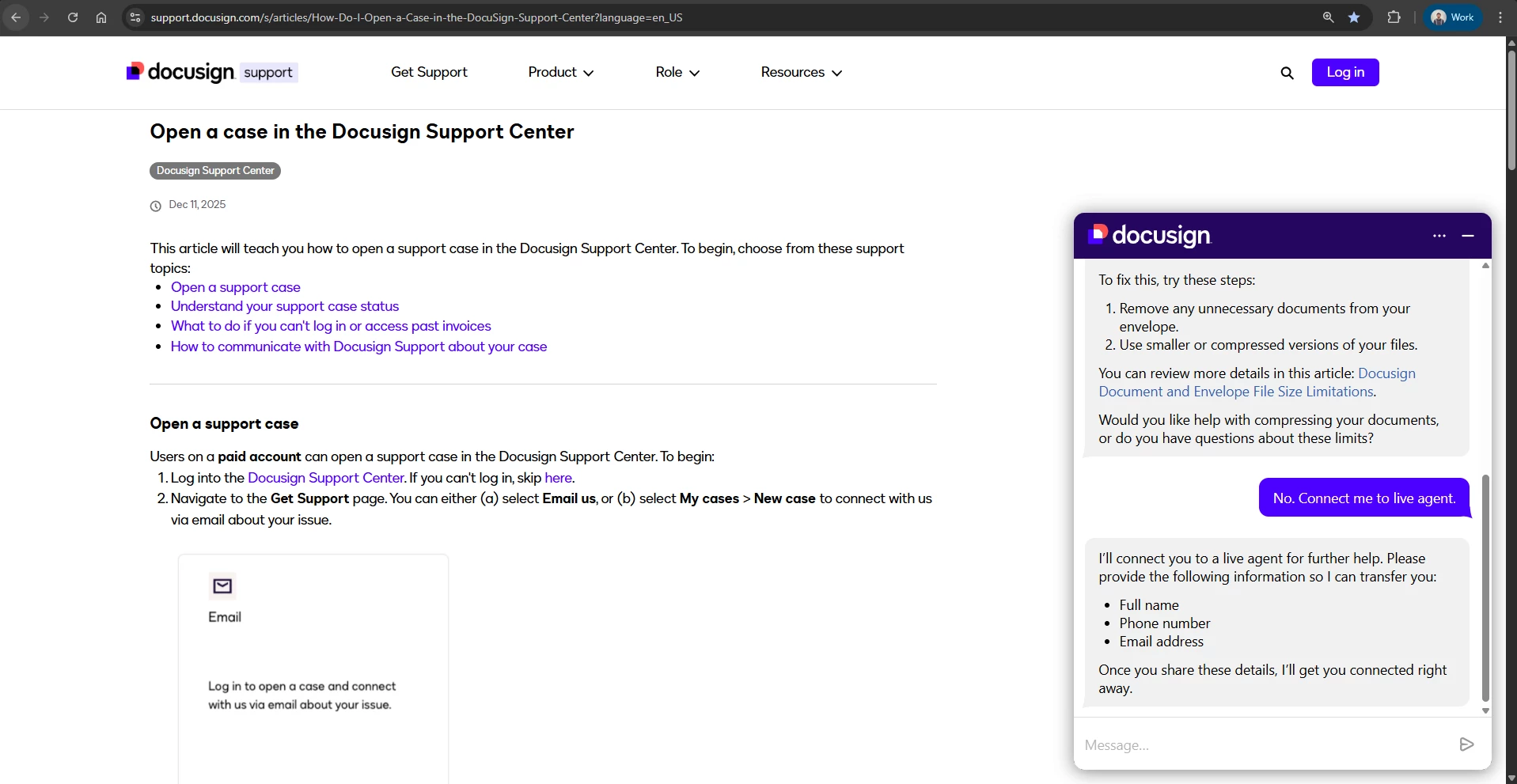 We cannot contact DocuSign support - the chat widget does not load/function in Firefox browser. This is blocking us from opening a support ticket through normal channels.