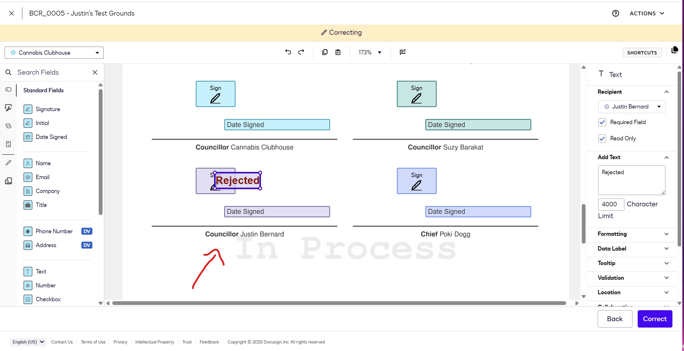 I’ve attached two images to simplify explaining this. The first one shows my PDF of the envelope (no text tab seen), and the second image shows the Correction of the envelope (with text tab “Rejected” visible). Is there a reason why I cannot see my text tab “Rejected” in the embedded signing or PDF of the envelope? Can I allow signers to see added text tabs when signing? This would help clarify if a user has rejected an envelope for all signers.