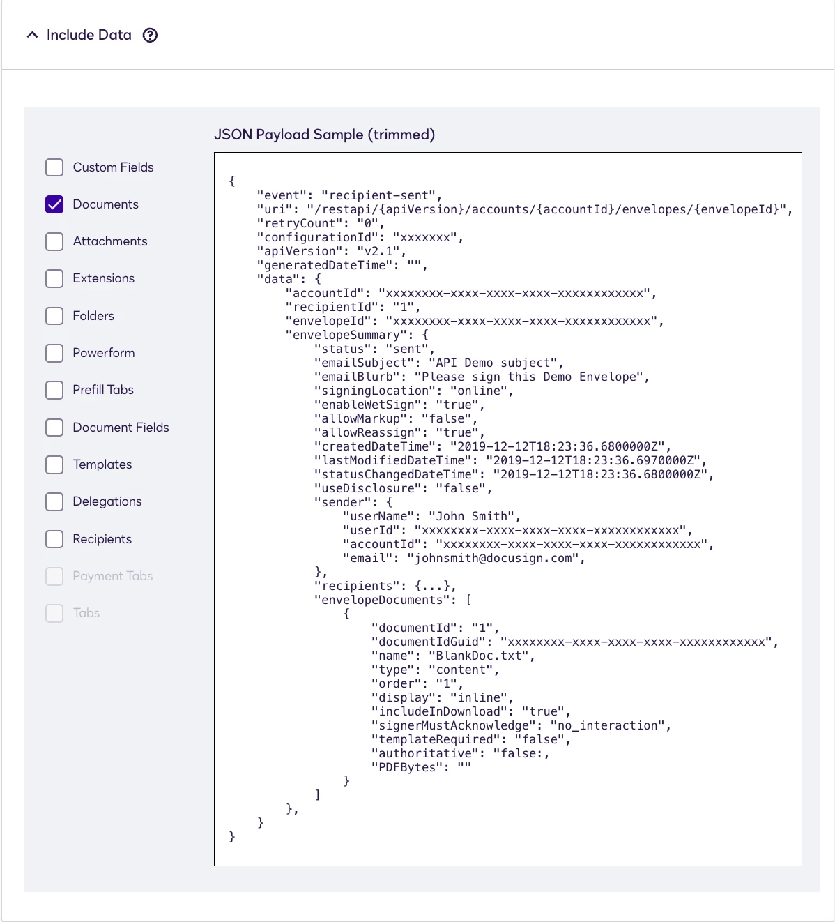 Answer: To ensure that the document is included in the Connect payload, the Connect configuration settings need to be updated. To find this setting, go to the Trigger Events setting, then expand the Envelopes and Recipients, and expand Include Data. Then select the checkbox for Documents.
