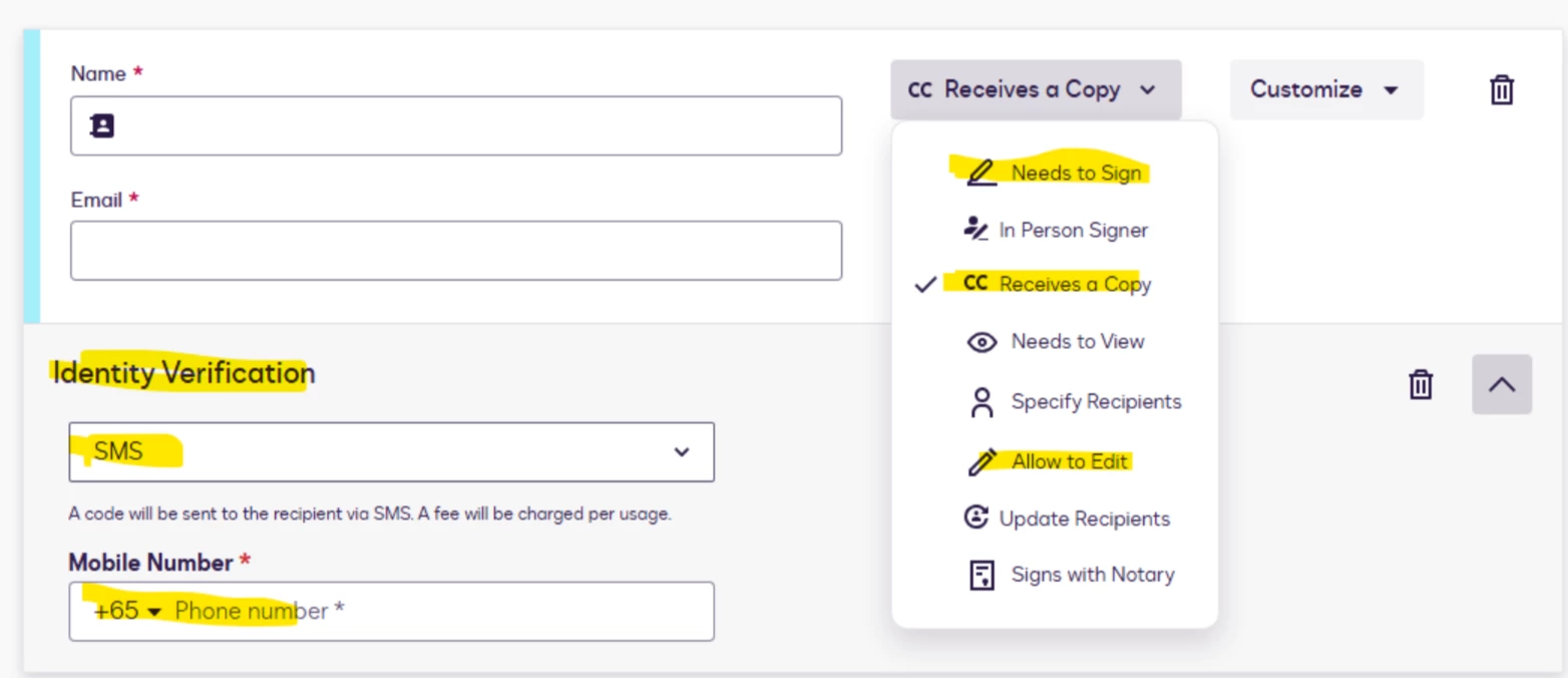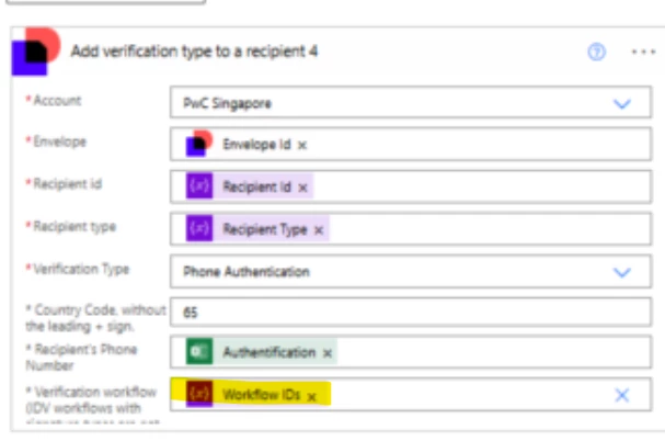 - Add verification type to the recipient - working for Verification Type set as Access code and None but not working for Phone Authentication and ID Verification. Asking for workflow ID- which I passed blank value , does throw any error but doesn't write the value in docusign application