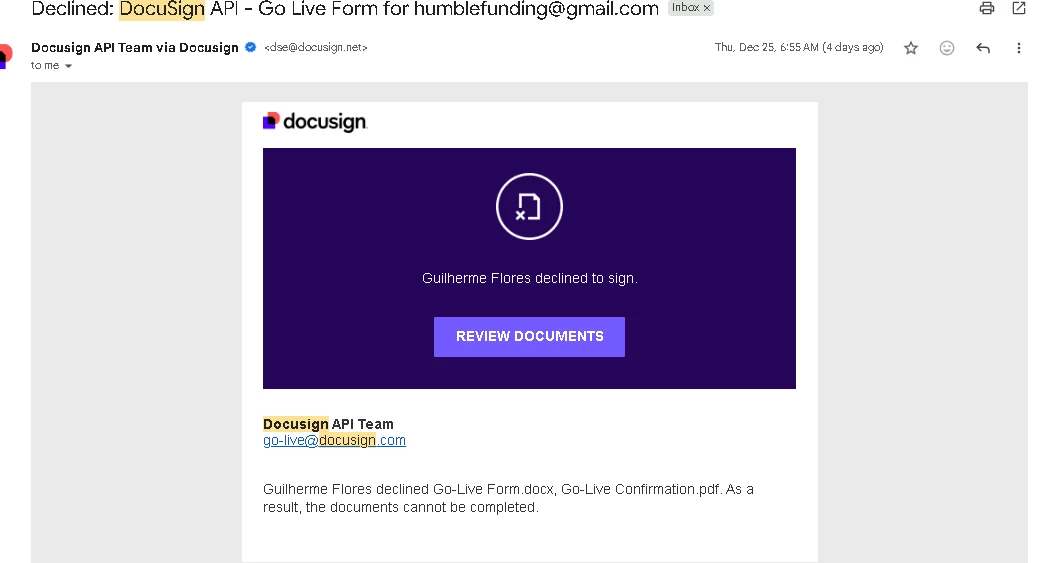 I recently submitted a Go Live request for a DocuSign API integration, and it was declined, but I did not receive any explanation, comments, or guidance on what needs to be fixed or updated.