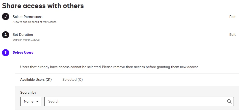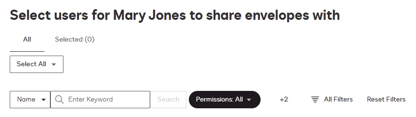 Ironically, the user search interface for the newer Shared Access feature is less user-friendly than the deprecated Shared Envelopes. With Shared Access, after you select the level of access and date(s), you see a dump of all users and you can only sort by name or email.