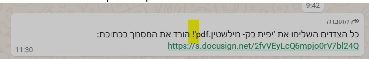 When all parties complete the signing process and the employee receives a copy of the contract via WhatsApp, an exclamation mark appears after the file name (see attached image). In Hebrew, an exclamation mark in a WhatsApp message is often perceived as pressure, anger, or a demand—even when the intention is completely innocent. I kindly ask that the exclamation mark be removed.
