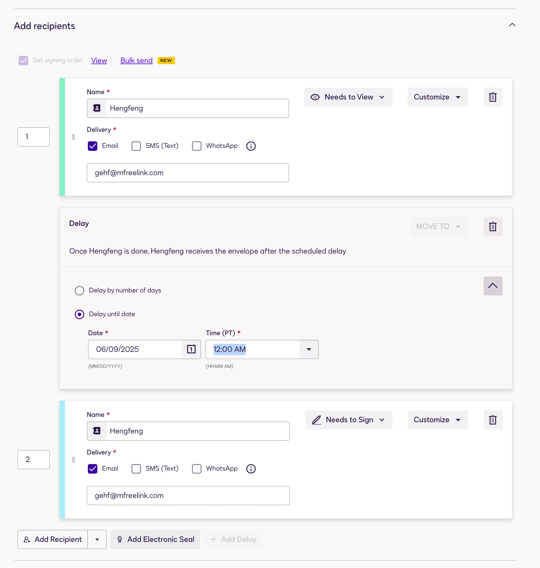 Example: Signer should not sign until 2 weeks from when they receive the Docusign envelope for a “consideration period”. If they sign too early we need to void their agreement and send a new one.