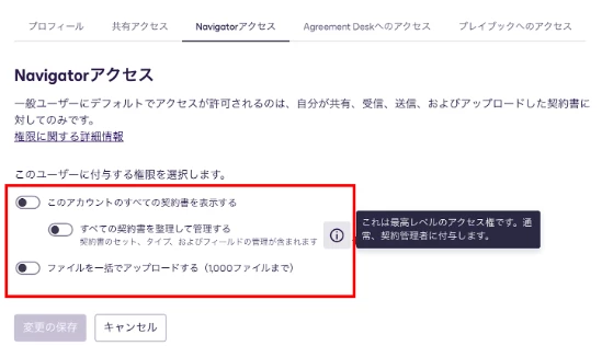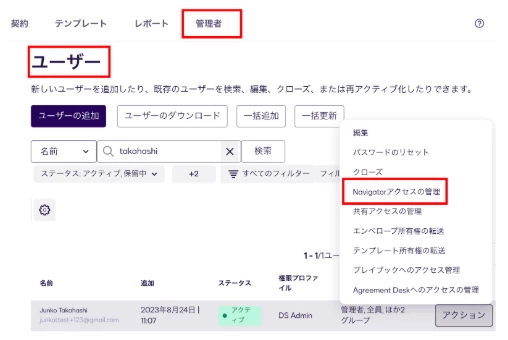この役割は、従来のeSignatureのDS Admin、つまりeSignatureアカウント自体の管理者のタスクの延長にあると考えることができ、アカウント内のユーザーとグループについて、Navigatorにどのレベルのアクセスを与えるかを管理する人になります。