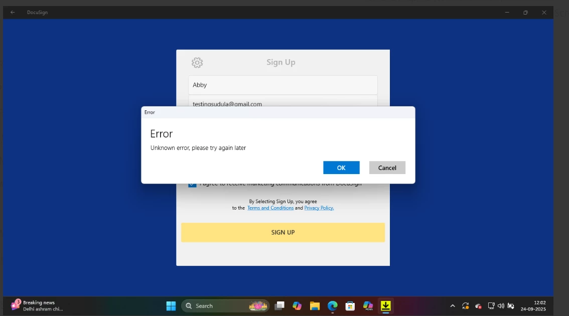 I am getting “Unknown error, please try again later” while trying to signup for DocuSign UWP app via Microsoft Store.