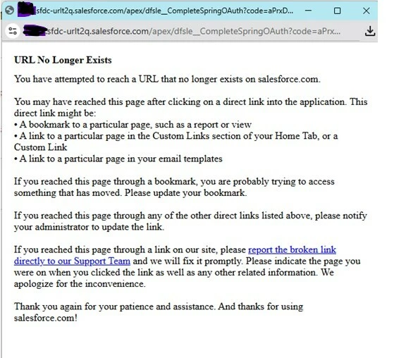 The URL in the error message contains apex/dfsle__CompleteSpringOAuth